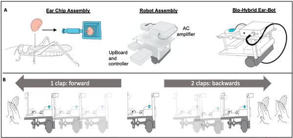 论文表明,研究团队设计了一个生物混合平台——Ear-Bot,它集成了沙漠蝗虫的听觉系统作为传感器输入,并连接到一个移动机器人平台。
