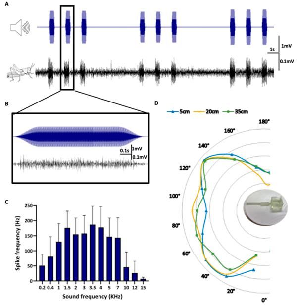 也就是说,蝗虫的耳朵对各种频率都比较敏感,可以对真实的声音做出反应。如下图所示,其最佳响应在3.5kHz(±2)左右,对不同方向的声音响应没有明显变化,对5-35cm距离的声音响应没有差异。