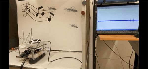 当研究人员拍手时,蝗虫的耳朵会识别声音并将其转换成电信号,传输到机器人的电生理测量系统、控制器和信号处理系统。