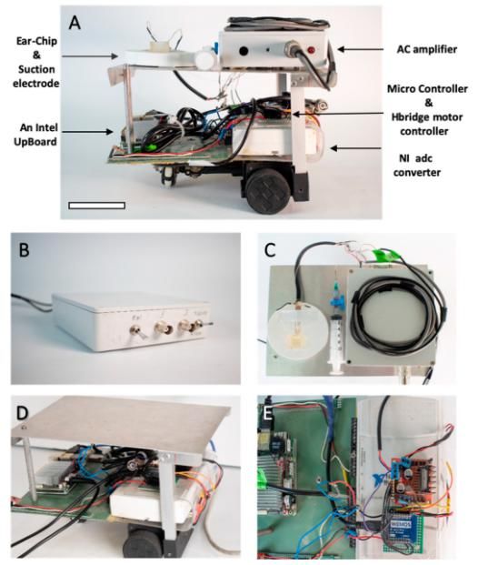 同时,Ear-Bot 还配备了定制电极,用于测量耳朵的电生理反应并将其传输给机器人。如上图b所示,机器人还集成了处理信号和运行不同算法所需的所有电子设备(包括前置放大器、电路板等)。